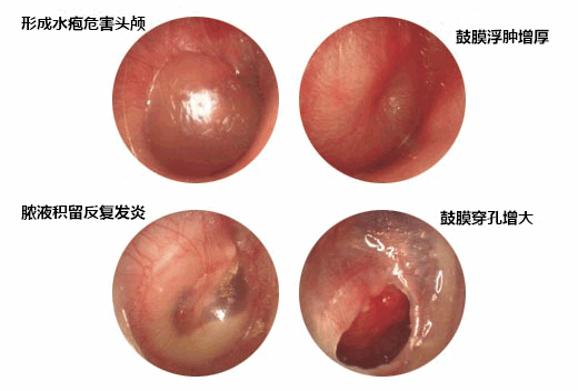 1、反复中耳炎会使鼓膜穿孔增大、中耳粘连硬化