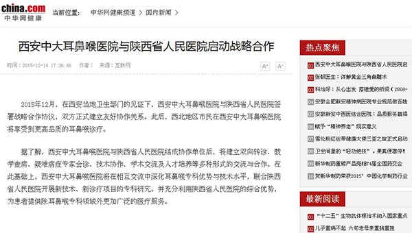 中华网健康 12月14日讯 2015年12月,在西安当地卫生部门的见证下,西安新城中大耳鼻喉医院与陕西省医院签署战略合作协议,双方正式建立友好协作关系。此后,西北地区市民在西安新城中大耳鼻喉医院将享受到更高品质的耳鼻喉诊疗。