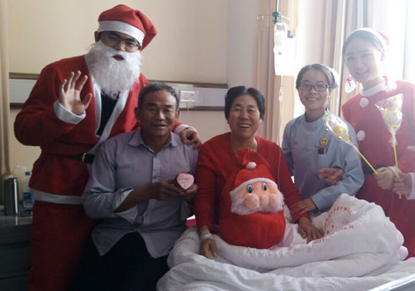 躺在病床暂时还不能过多活动的患者,收到礼物和祝福,感受到圣诞老人带来的新鲜和热闹,顿时驱走烦闷,注入了活力。