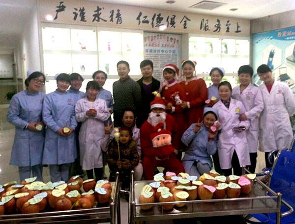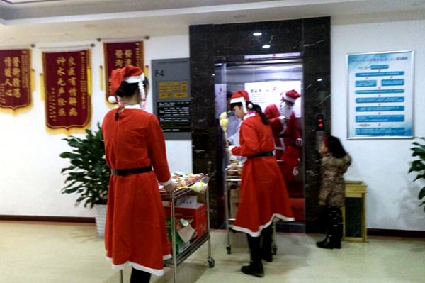 一大早,西安新城中大耳鼻喉医院后勤处就开始忙碌,安排人员采办物资、准备礼品,制定计划,分配各自工作任务……整个上午马不停蹄。中午1点半,换好服装,推着精心准备的礼物,圣诞老人降临医院,完成了这一场有预谋的惊喜事件。